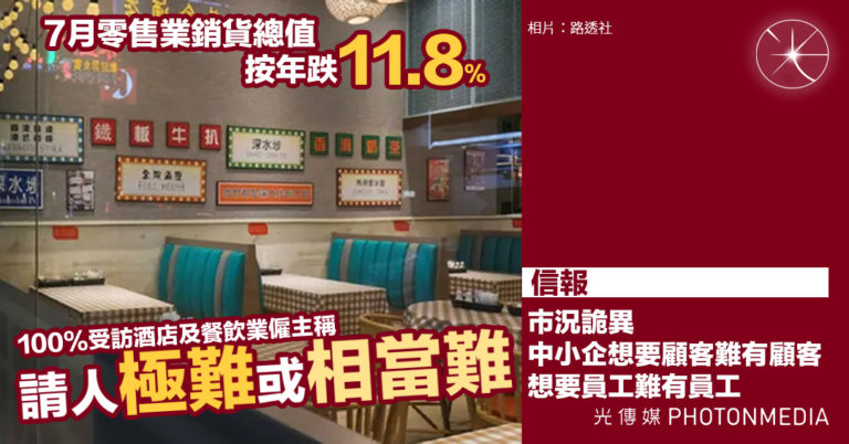 7月零售業銷貨總值按年跌11.8% 酒店餐飲業請人難 《信報》:市況詭異