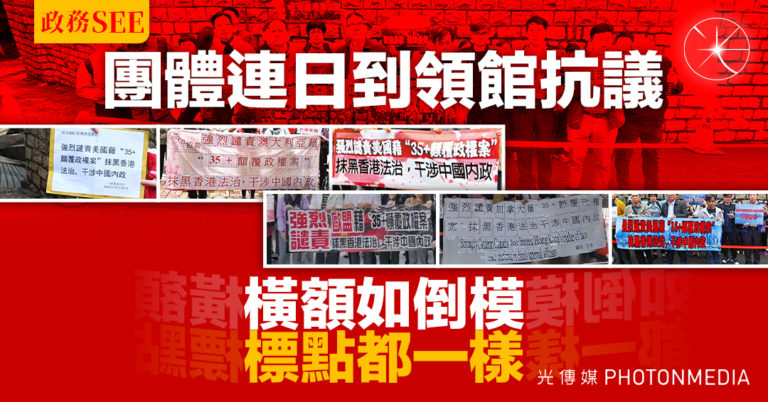 政務SEE〡團體連日到領館抗議 橫額如倒模 標點都一樣