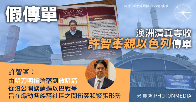 澳洲清真寺收「許智峯親以色列」假傳單 許:當地官員透露由澳門寄出