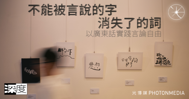 展場內,牆上掛滿字句:「獅子山下」、「…