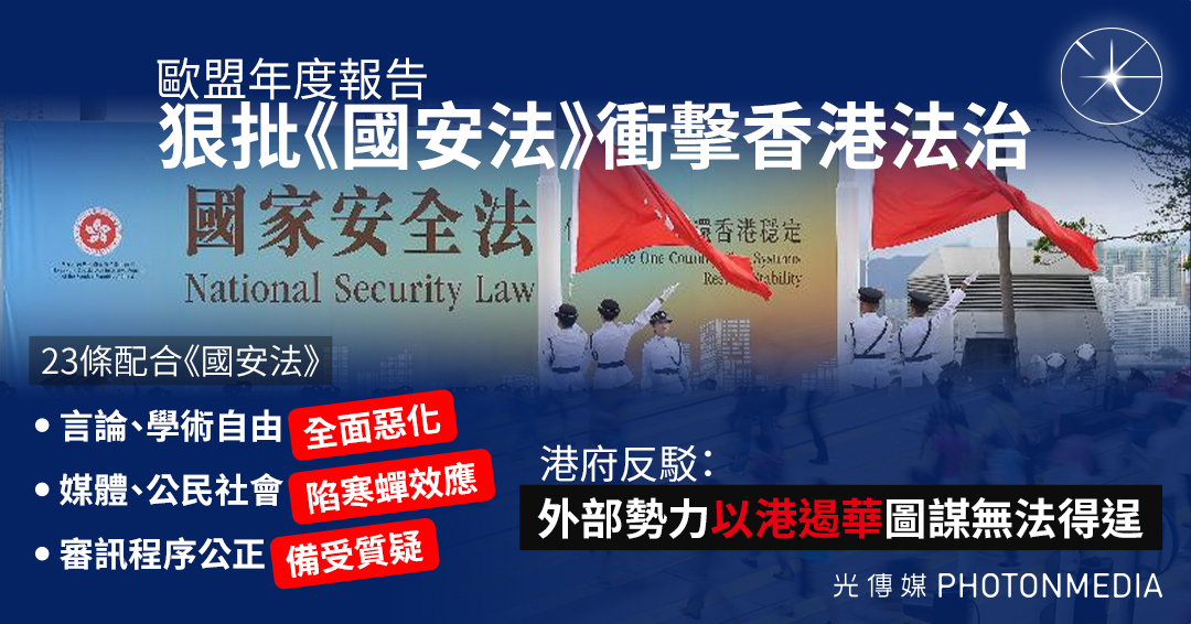 香港法律環境雖然走向威權主義,但商業法和民事法在很大程度上仍未受影響。特區政府昨(9日)深夜11時發布逾5,800字新聞稿,就歐盟「所謂年度報告」表示強烈不滿和反對。新聞公報指,歐盟對香港內政指手畫腳,赤裸裸地展現其雙重標準,而香港自回歸以來,一直在《憲法》與《基本法》框架下全面落實「一國兩制」,法治精神固若金湯,外部勢力「以港遏華」的圖謀不會得逞,香港法治也沒有任何倒退,任何形容香港正成為極權城市的說法絕非事實。