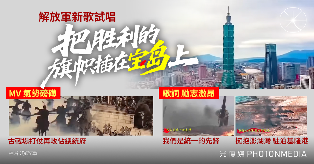 作為中國主要負責對台的部隊,解放軍東部戰區負責組織近年的「圍台軍演」,其陸軍政治工作部微信公眾號「人民前線」上周六(13日)介紹新曲《把勝利的旗幟插在寶島上》,表示「統一的號角吹響」、「強音激盪、使命催征,以歌詠志、以樂抒懷」、「將強軍信念融入鏗鏘旋律,用歌聲培塑血性膽魄,用誓言激昂精強能,用號角凝聚攻堅力量」。
