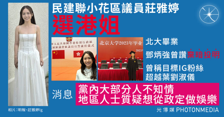 民建聯區議員莊雅婷參選港姐 1日後稱為保區會形象退選