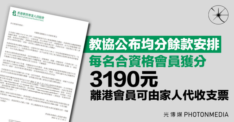 教協公布均分餘款安排 每名合資格會員獲分3,190元 離港會員可由家人代收支票