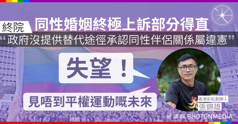 同性婚姻終極上訴部分得直|終院:政府沒提供替代途徑承認同性伴侶關係屬違憲|香港彩虹創辦人張錦雄:失望!見唔到平權運動嘅未來