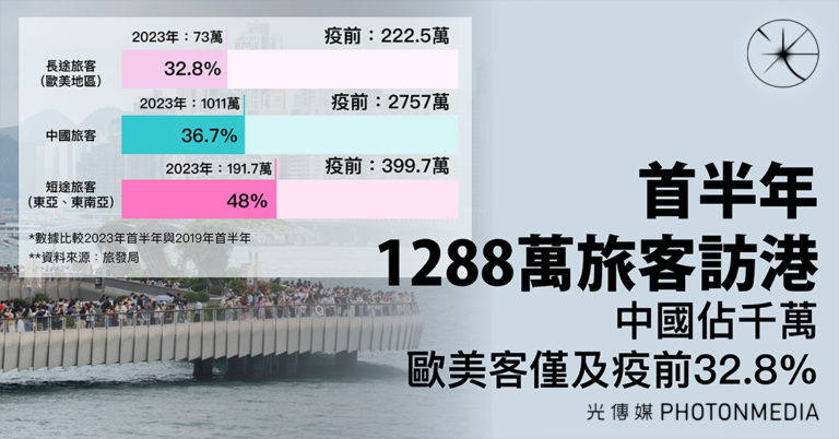 首半年1288萬旅客訪港 中國佔千萬 歐美客僅及疫前32.8%