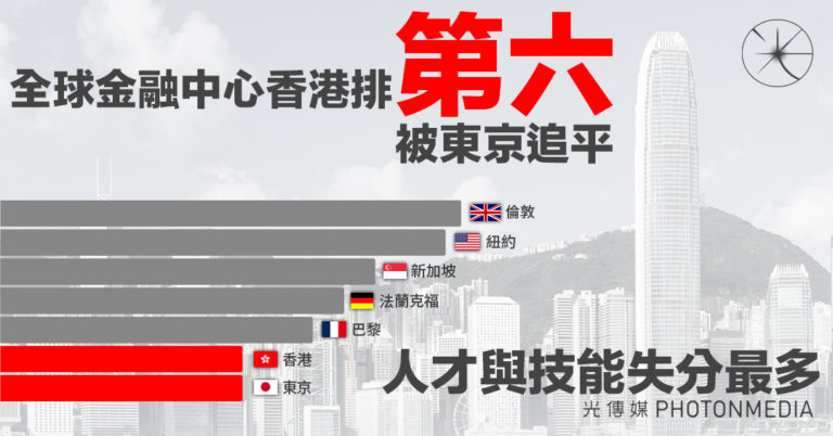 調查:全球金融中心香港排第六 被東京追平 人才與技能失分最多