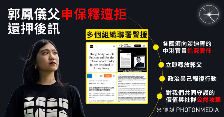 郭鳳儀父申保釋遭拒還押後訊 多個組織聯署聲援 呼籲各國政府嚴厲譴責中港當局】