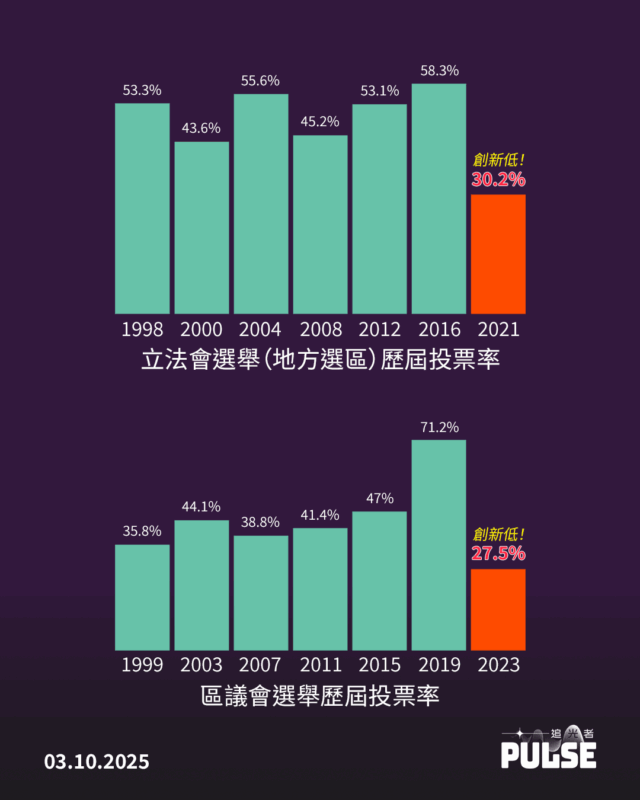 2021年的投票率的確「低處未算低」,到2023年區議會直選投票率只剩27.54%,史上最低。該場被政府「完善」的區議會選舉新制度,令直選議席由原來452席減至88席,只剩20%議席透過地方直選產生,其餘則是互選的「地區委員界別」及特首委任議席。