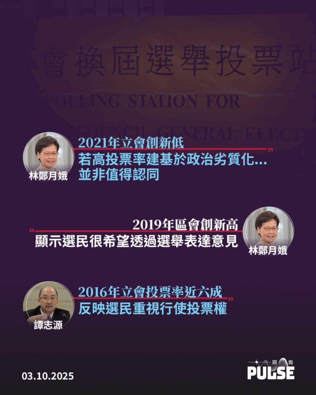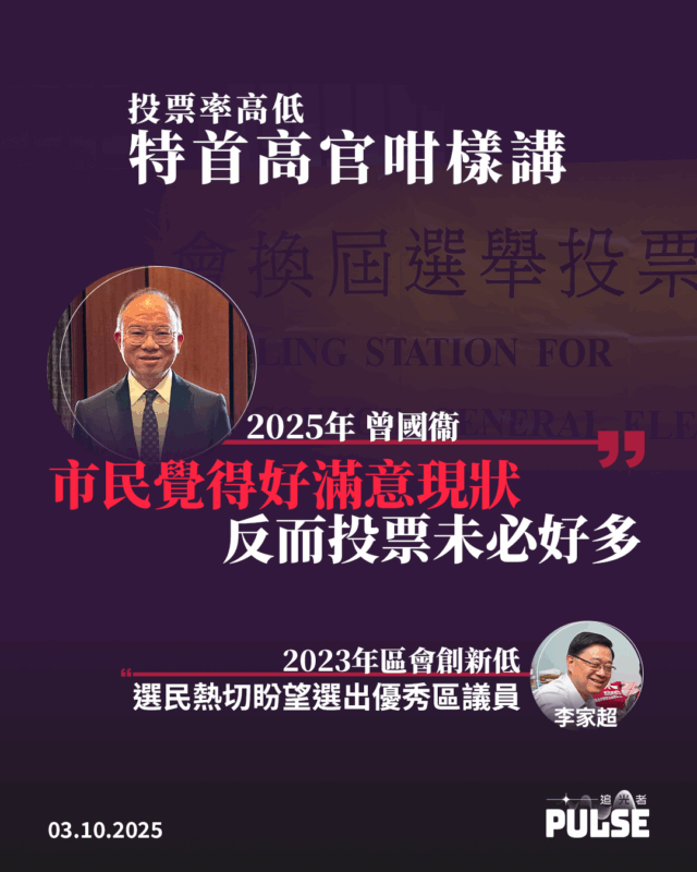特首李家超強調會辦好年底的立法會換屆選舉,政制及內地事務局長曾國衞昨(2日)被問到近年選舉投票率低的原因,他反指「過往投票最多的時候,是香港最亂的時候……市民覺得好滿意情況、滿意現狀,反而投票情況未必很多」。有前區議員向《追光者》分析,不同立場的選民可能因覺得「嘥氣」、「無競爭」而不再投票,直指曾國衞是「狗急跳牆」。翻查歷屆選舉投票率及官員回應,發現港府對投票率高低的解讀,曾經隨歲月有所改變,甚至推翻過往說法。